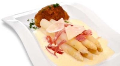 Belgium - Fried eggs, asparagus and beer syllabub with shavings of raw cow’s milk cheese and hamOEufs frits, asperges et sabayon à la bière, copeaux de fromage de vache au lait cru et jambon